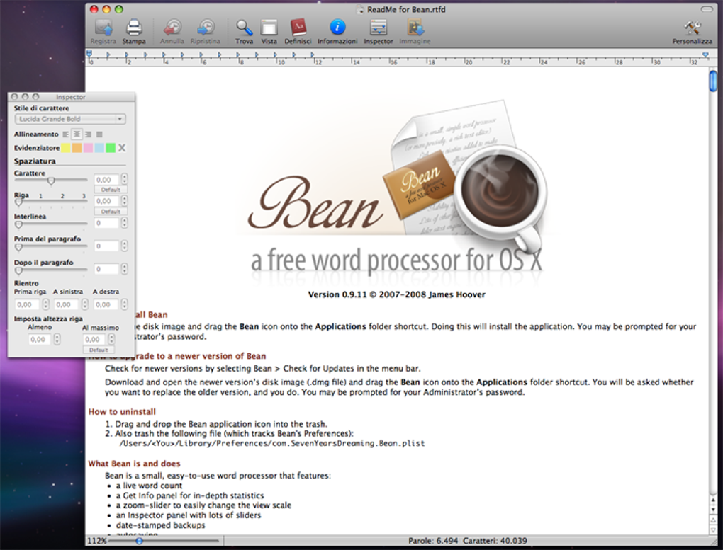 Bean è anche simpatico. Essenzialmente per la sua interfaccia. Un bel design, tutti i pulsanti giusti al posto giusto, comode barre di formattazione e finestre pop-up per la correzione ortografica e il computo delle parole. Insomma, Bean sarà anche il più piccolo tra i word processor, ma ha tutte le carte in regola per diventare il tuo preferito.
